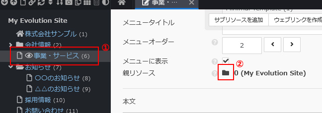 - ※ 「ページ」はEvolution CMSでは「リソース」と表現するため、ここでは以降「リソース」と呼称します。