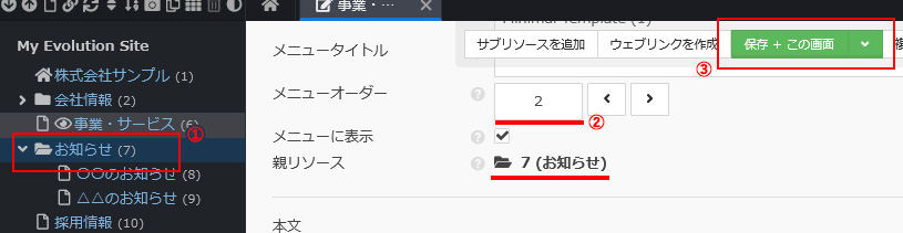 同じ階層内の位置を変更したい場合は、「メニューオーダー」項目を変更します。