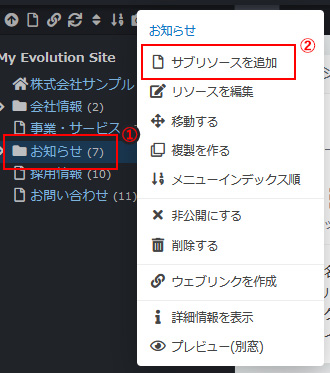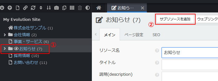 - ※ 「ページ」はEvolution CMSでは「リソース」と表現するため、ここでは以降「リソース」と呼称します。